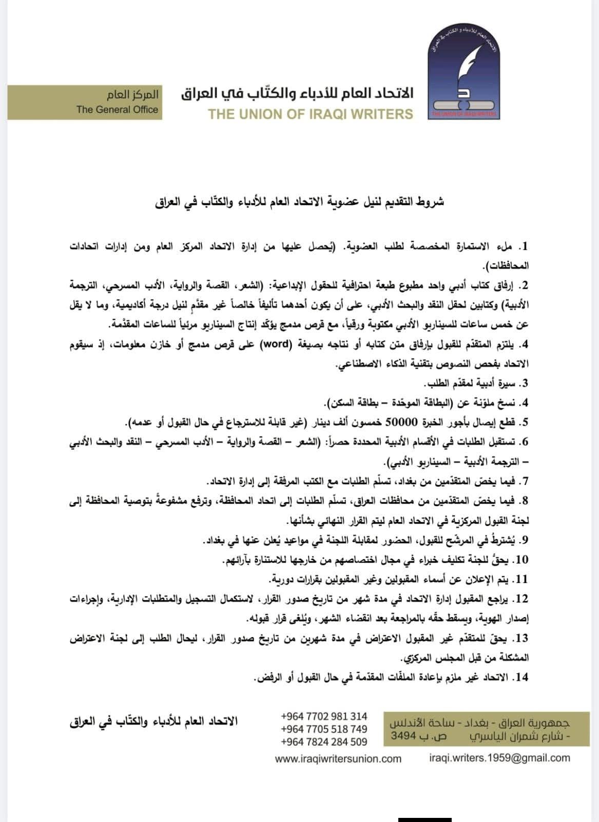 اعلن الاتحاد العام للأدباء والكتّاب في العراق عن فتح باب التقديم وفق ضوابط محددة، داعيا الراغبين بالانضمام للاتحاد، التواصل مع إدارات اتحادات محافظاتهم.