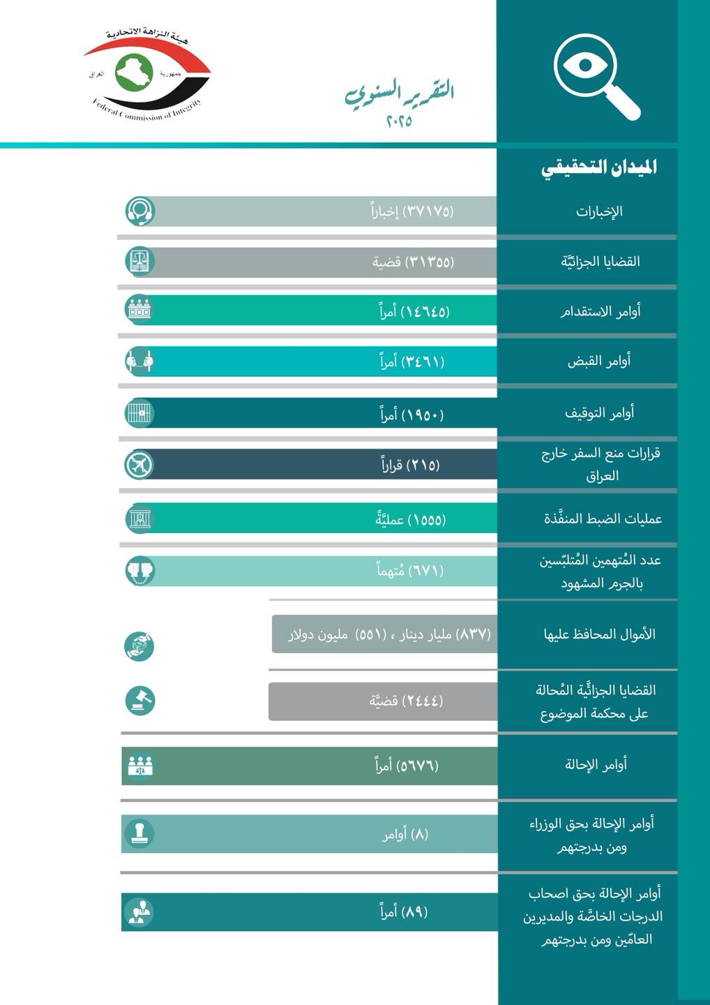 أعلنت هيئة النزاهة الاتحادية، اليوم الأحد، عن مُجمل إنجازاتها للعام 2025.