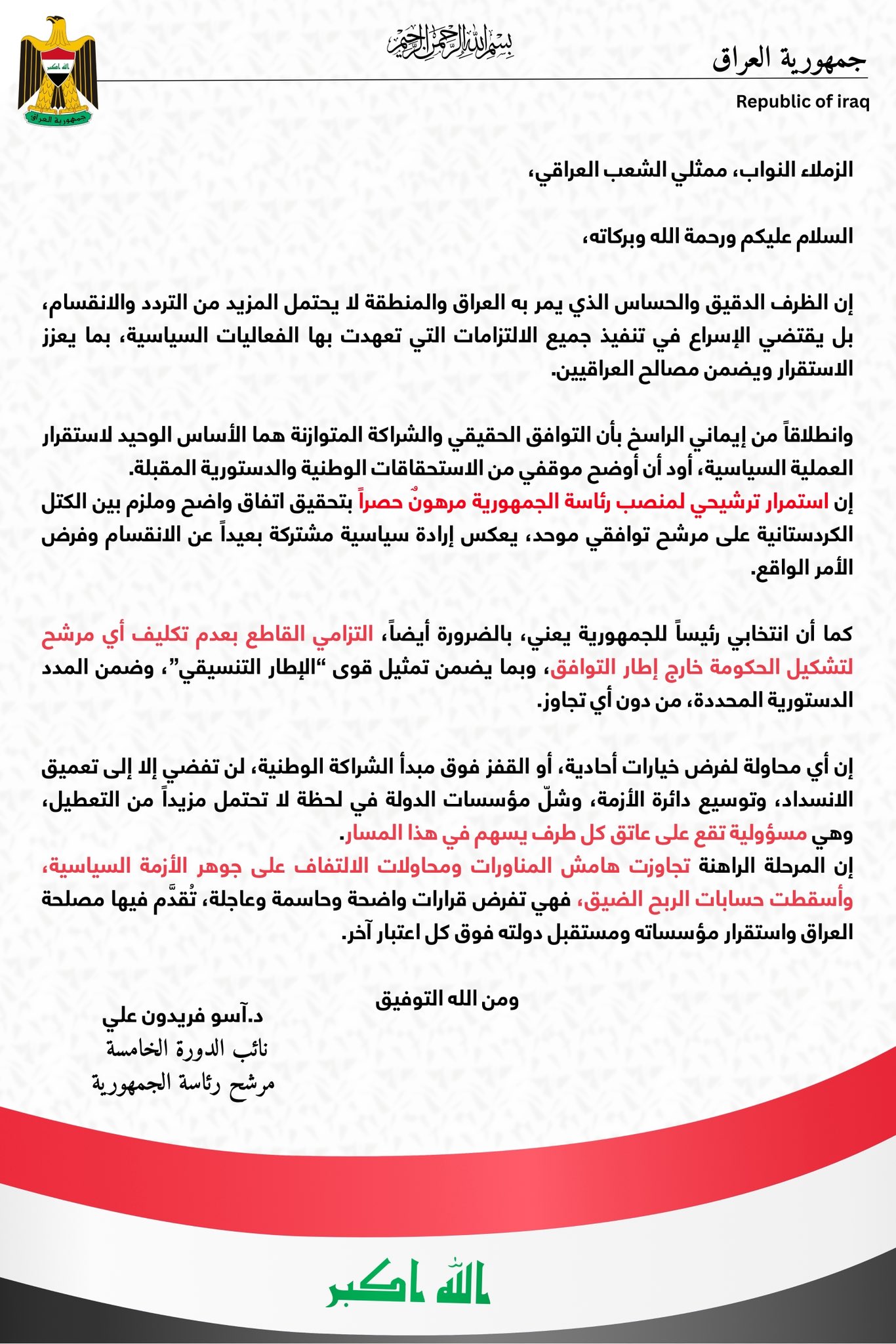 اعلن المرشح لرئاسة الجمهورية آسو فريدون في بيان، "لا ترشيح بلا توافق… ولا تكليف خارج الشراكة الوطنية".