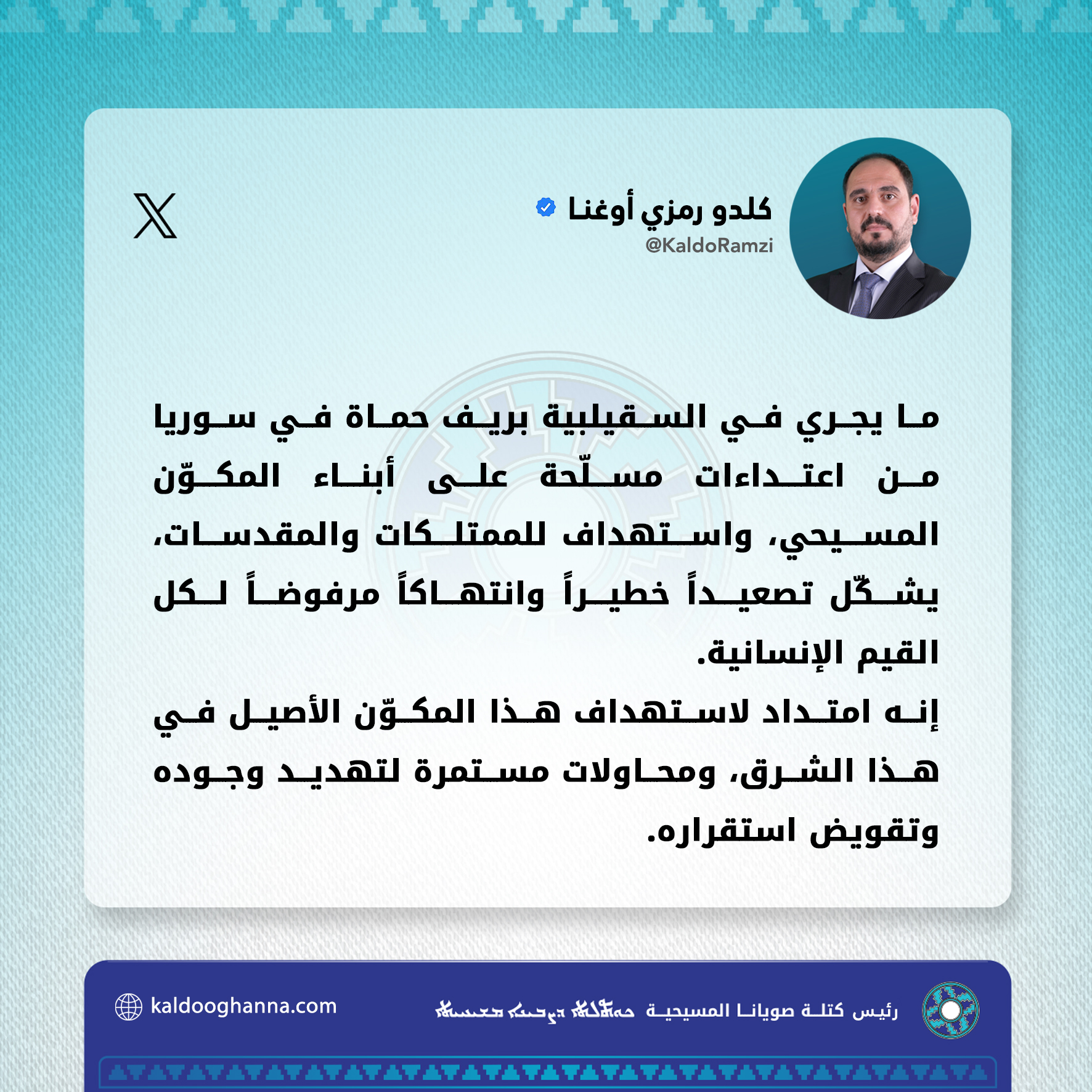 -ما يجري في السقيلبية بريف حماة في سوريا من اعتداءات مسلّحة على أبناء المكوّن المسيحي، واستهداف للممتلكات والمقدسات، يشكّل تصعيداً خطيراً وانتهاكاً مرفوضاً لكل القيم الإنسانية.