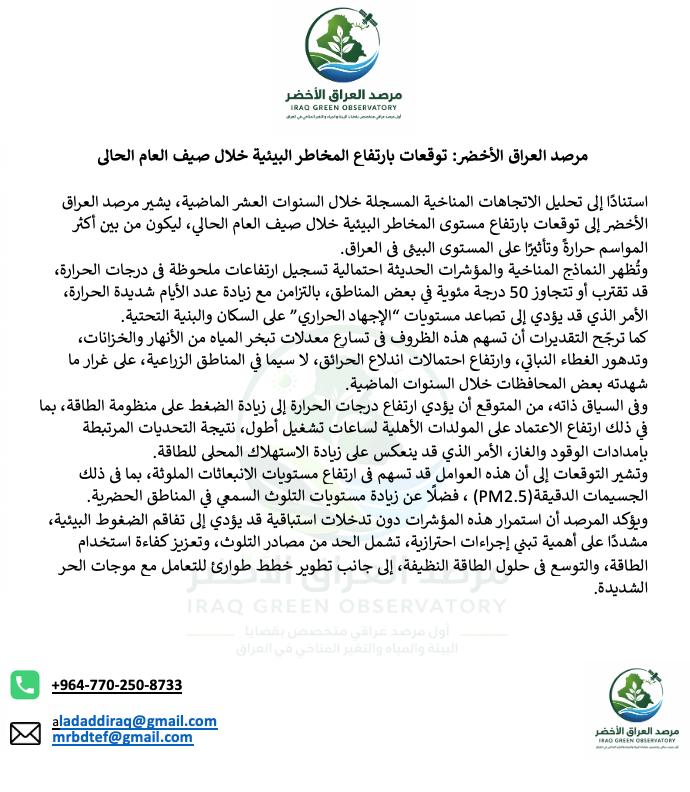 توقع مرصد العراق الأخضر بارتفاع مستوى المخاطر البيئية خلال صيف العام الحالي، ليكون من بين أكثر المواسم حرارةً وتأثيرًا على المستوى البيئي في العراق.