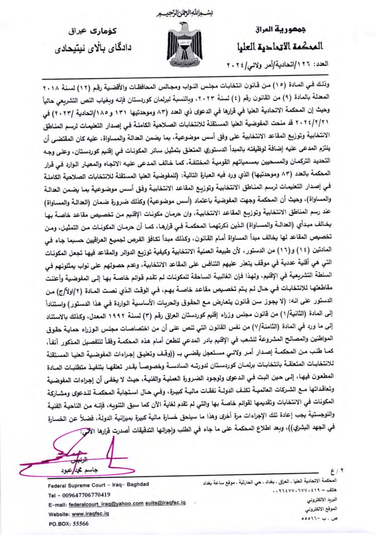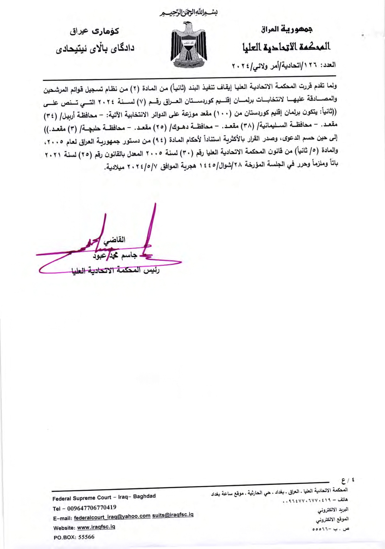 لەوەڵامی سكاڵاكهی مەسرور بارزانی، سهرۆكی حكومهتی ههرێمی كوردستان كه دوێنێ دووشهممه ئاراستهی دادگاكهی كردبوو، ئهمرۆ سێشەممە، دادگای باڵای فیدراڵیی عێراق لە وەڵامی سکاڵایەکی مەسرور بارزانی، سەرۆکی حکوومەتی هەرێمی کوردستان؛ فەرمانێکی "وەلائی" دەرکرد بە مەبەستی ڕاگرتنی جێبەجێکردنی بڕگەی (دووەم)ی ماددەی (2) لە سیستمی تۆمارکردن و پەسەندکردنی لیستی کاندیدەکانی هەڵبژاردنی پەرلەمانی هەرێمی کوردستان ژمارە (7)ی ساڵی 2024، کە تێیدا هاتووە (پەرلەمانی هەرێمی کوردستان لە (100) کورسی پێکدێت کە بەسەر ئەم بازنانەی هەڵبژاردندا دابەشکراون: پارێزگای هەولێر 34 کورسی، سلێمانی 38 کورسی، دهۆک:25 کورسی و هەڵەبجە 3 کورسی).