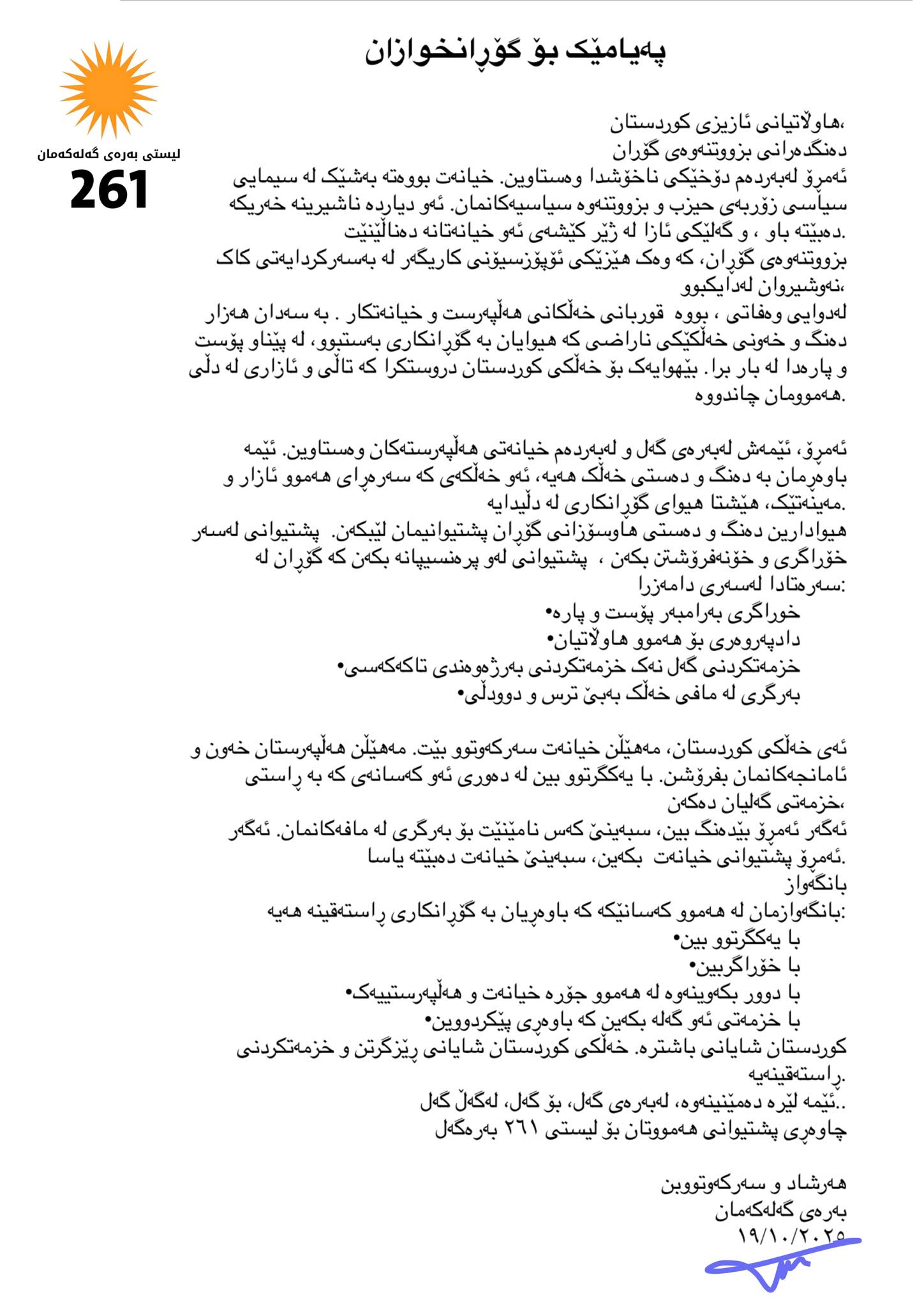 له راگهیهندراوهكهدا هاتووه كه "ئهمڕۆ، ئێمهش لهبهرهی گهل و لهبهردهم خیانهتی ههلپهرستهكان وهستاوین. ئێمه باوهڕمان به دهنگ و دهستی خهڵك ههیه، ئهو خهڵكهی كه سهرهڕای ههموو ئازار و مهینهتێك، هێشتا هیوای گۆڕانكاری له دڵیدایه. هیوادارین دهنگ و دهستی هاوسۆزانی گۆڕان پشتیوانیمان لێبكهن. پشتیوانی لهسهر خۆراگری و خۆنهفرۆشتن بكهن، پشتیوانی لهو پرهنسیپانه بكهن كه گۆڕان له سهرهتادا لهسهری دامهزرا".