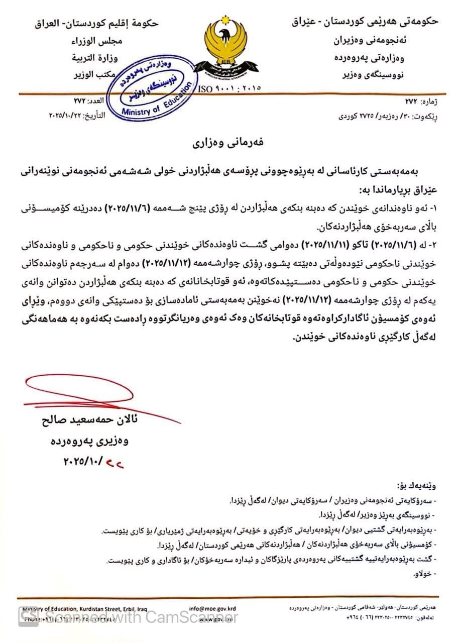 ئەمڕۆ چوارشەممە 22ی تشرینی یەکەمی 2025، وەزارەتی پەروەردەی حکومەتی هەرێمی کوردستان رایگەیاند، "بەهۆی هەڵبژاردنەکانی پەرلەمانی عێراقەوە لە رۆژی 06-11-2025 تاوەکو 11-11-2025 لە ناوەندەکانی خوێندن پشووە".