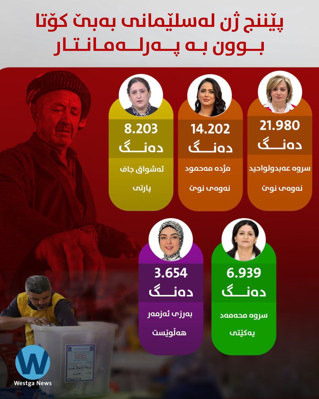 بەڕێوبەری فەرمانگەی ژینگەی سلێمانی ئەمڕۆ شەممە خۆشحاڵی خۆی دەربڕی کەپێنج ژن لەسنوری بازنەی سلێمانی توانیویانە بەبێ سیستەمی کۆتا سەرکەوتن بۆ پەرلەمانی عێراق بەدەستبهێنن.