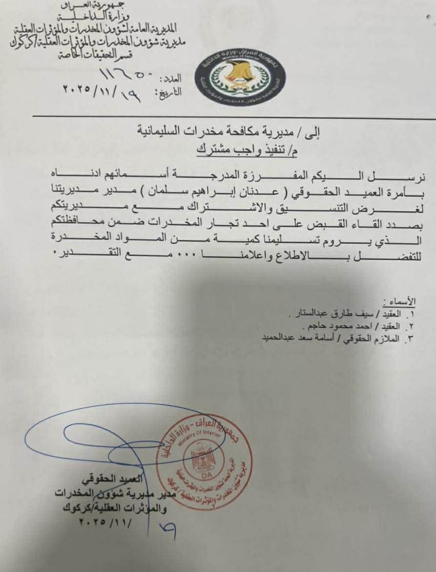 ئاماژهشی بهوهداوه كه "دوای ئهوهی نوسراوی فهرمی دادوهری لێكۆڵینهوهی بهڕێوهبهرایهتی مادده هۆشبهرهكانی كهركوكمان بهدهست گهیشت، بهڕێوهبهرایهتی گشتی نههێشتنی مادده هۆشبهرهكانی دهزگای ئاسایشی ههرێم به ههماههنگی تیمێكی بهڕێوهبهرایهتی مادده هۆشبهرهكانی كهركوك كه پێكهاتبون له بهڕێوهبهری بهڕێوهبهرایهتی ناوبراو به هاوهڵی سێ ئهفسهری ههمان بهڕێوهبهرایهتی، بهسهركهوتوانه توانرا بازرگانێكی ماددهی هۆشبهر دهستگیربكهن و دهستبگرن بهسهر بڕی سێ كیلۆگرام حهشیش".