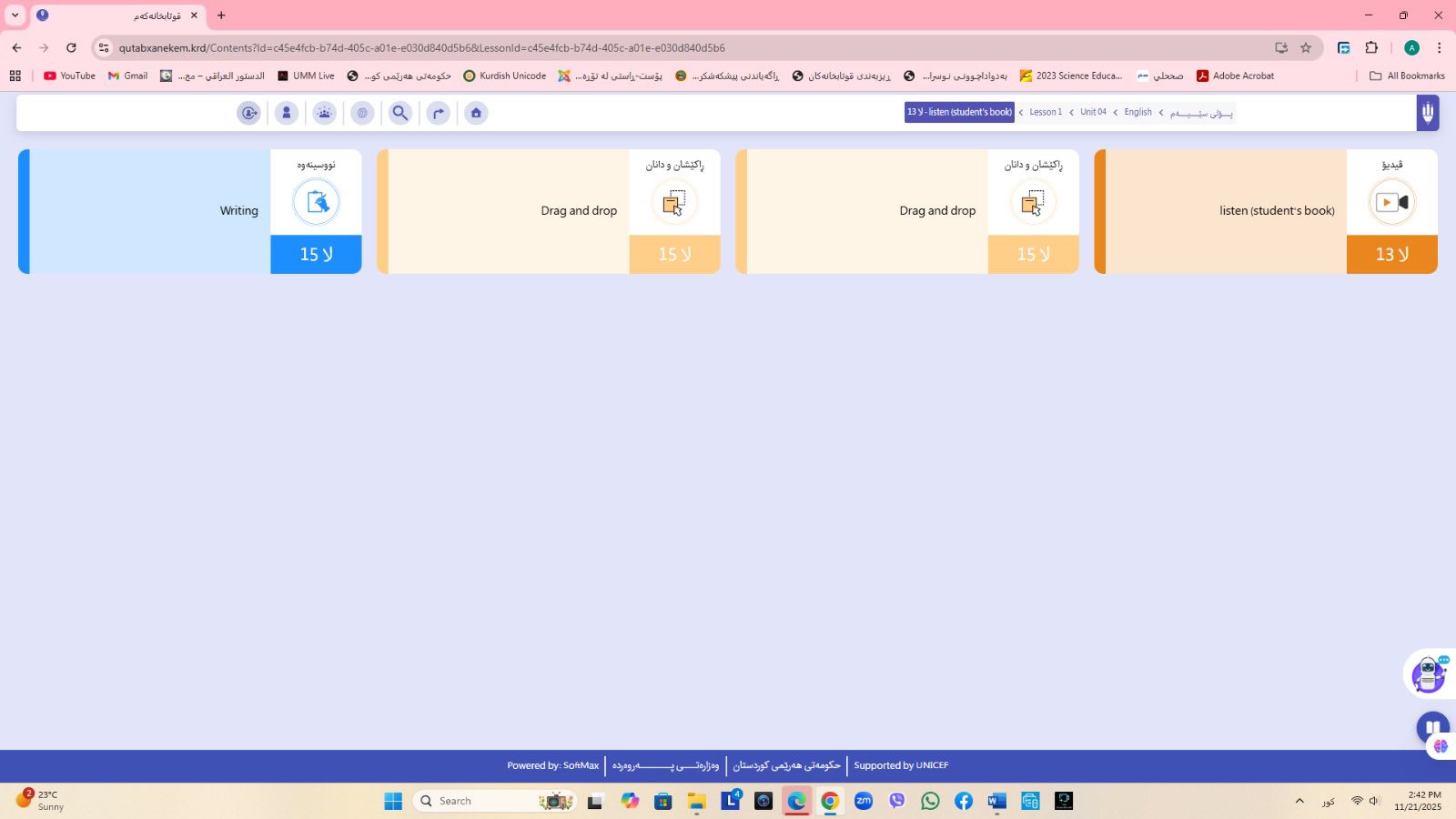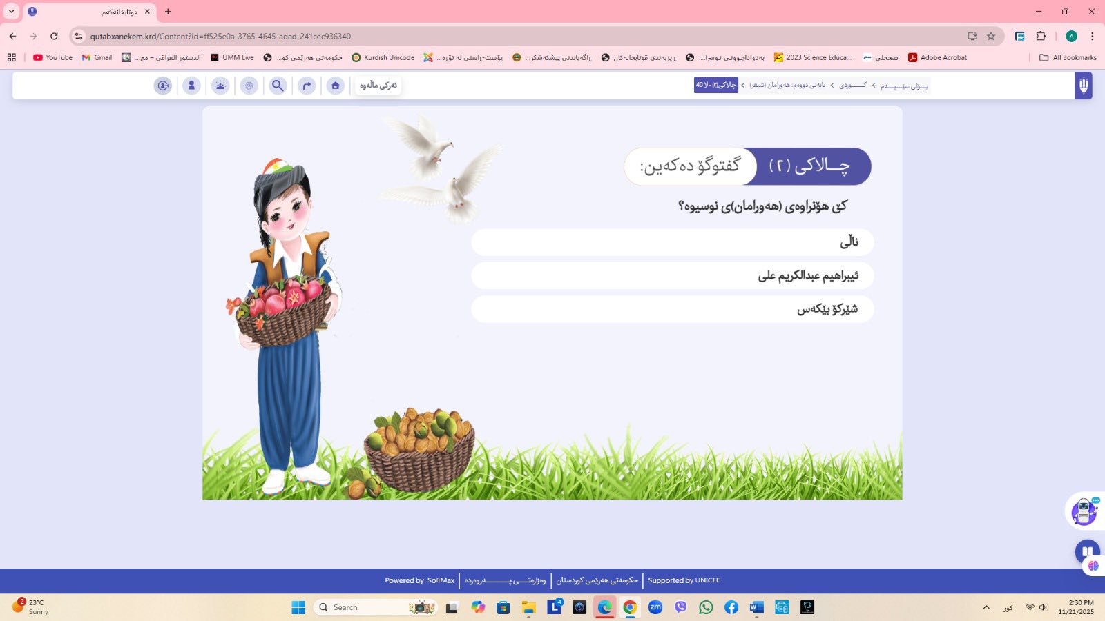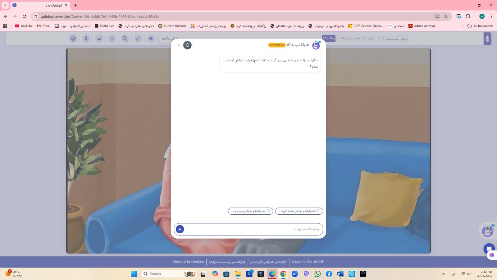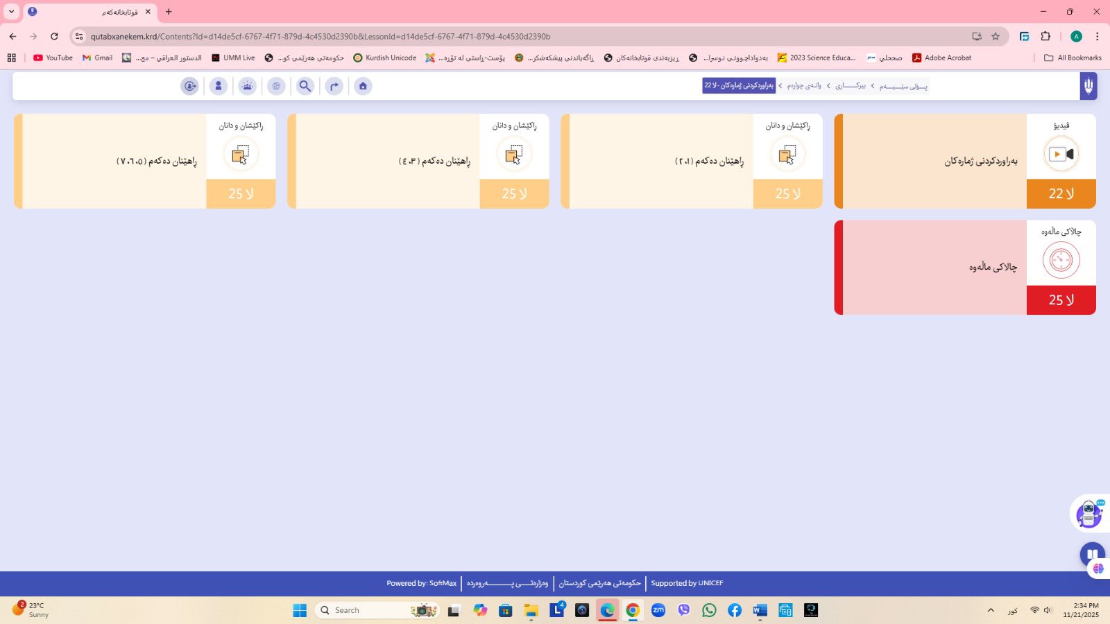 ئاماژهشی بهوهداوه كه "پلاتفۆرمی (قوتابخانهكهم) كه ئێستا سێ پۆلی خوێندنی تهواو كارایه و پۆلهكانی 4 و 5ی بنهڕهتیش لهژێركاركردندان، بۆ كۆتایی ساڵی 2026 ههموو پۆل و قۆناغهكانی خوێندنی بنهڕهتی تهواو دهكرێن، تیمی خۆماڵی و بههاوبهشی رێكخراوی یونسێف ئهنجامی دهدهین، دهبێته وهرچهرخانێكی گرنگی پرۆسهی فێربوون له كوردستان".