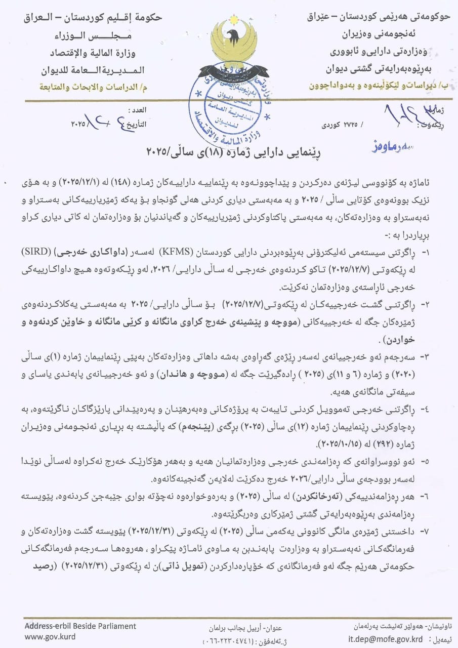 وەزارەتی دارایی و ئابووری حكومەتی هەرێمی کوردستان لە ئەمڕۆ یەکشەممە 7ی کانونی یەکەمی 2025 سەرجەم خەرجییەكانی بۆ ساڵی دارایی 2025 راگرت.