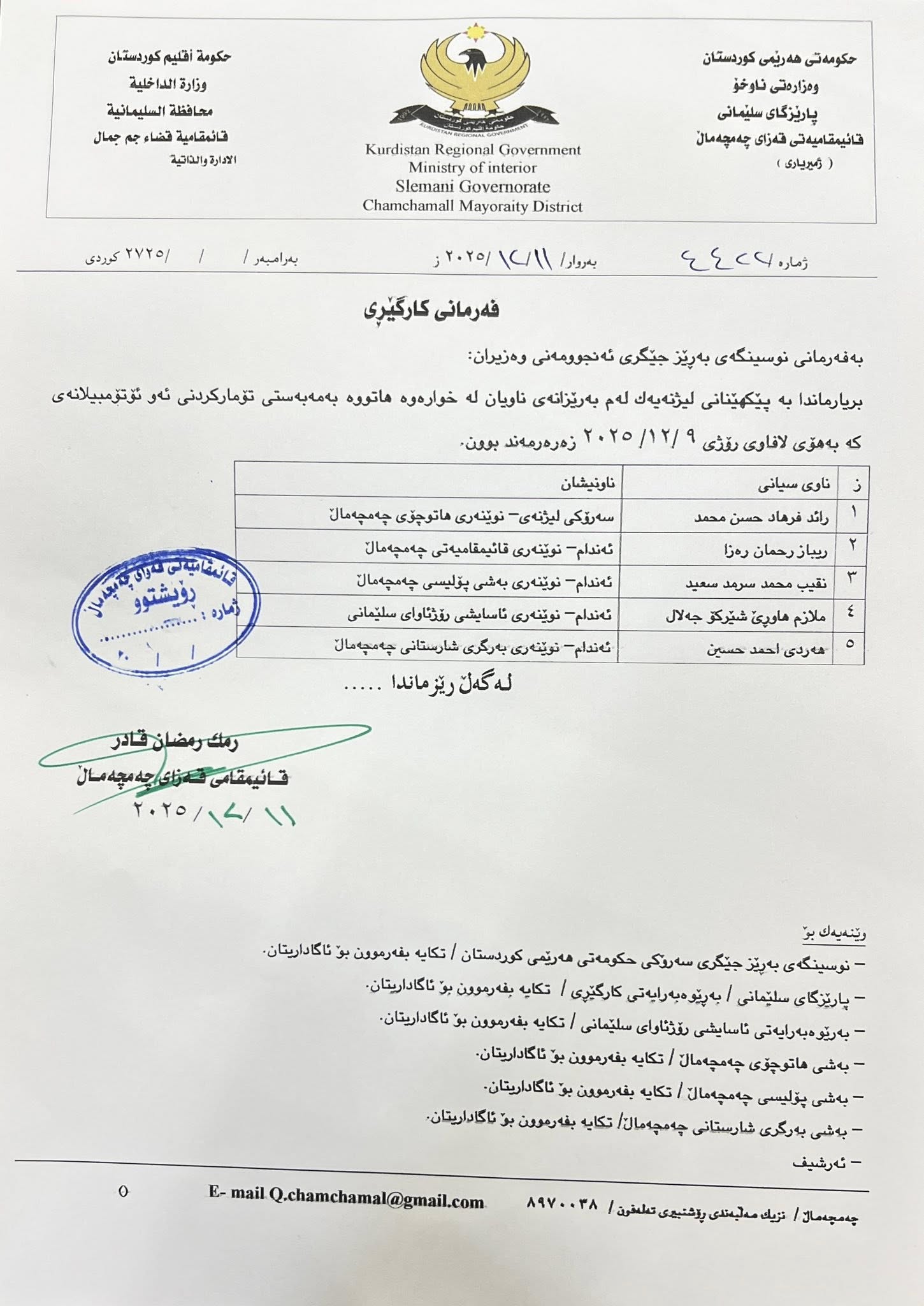 ئهمڕۆ پێنجشهممه 11ی كانوونی یهكهمی 2025 رهمك رهمهزان قائیمقامی چهمچهماڵ به نووسراوی ژماره 4422 و بهفهرمانی نووسینگهی قوباد تاڵهبانی جێگری سهرۆك وهزیران بڕیاری پێكهێنانی لیژنهیهكی دا بهمهبهستی تۆماركردنی ئهو ئۆتۆمبێلانهی كه بههۆی لافاوی رۆژی 2025/12/9 زهرهرمهند بوون.