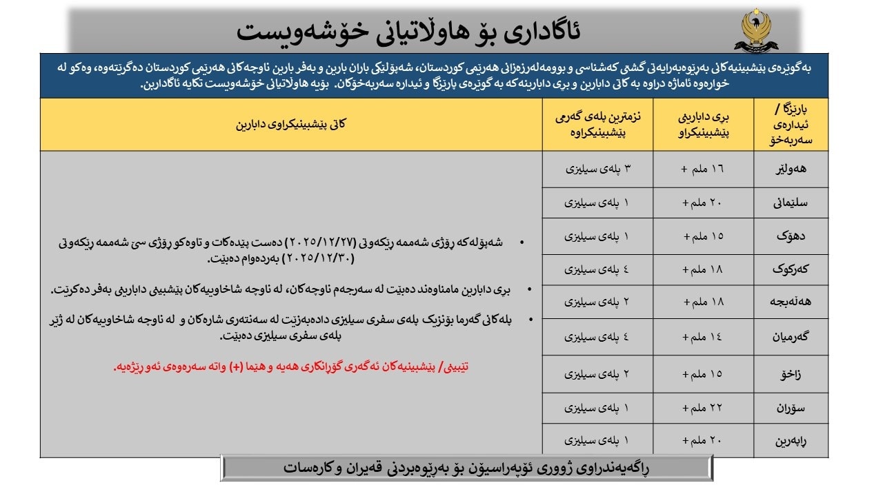 ئهمڕۆ سێشهممه ژووری ئۆپهراسیۆن بۆ بهڕێوهبردنی قهیران و كارهسات راگهیهندراوێكی بڵاوكردهوه و تیایدا هاتووه "بهگوێرهی پێشبینییهكانی بهڕێوبهرایهتی گشتی كهشناسی و بوومهلهرزهزانی ههرێمی كوردستان، له ڕۆژی شهممه 27ی كانوونی یهكهمی 2025 تاوهكو ڕۆژی سێشهممه 30ی كانوونی یهكهمی 2025، شهپۆلێكی باران بارین و بهفر بارین ناوچهكانی ههرێمی كوردستان دهگرێتهوه".