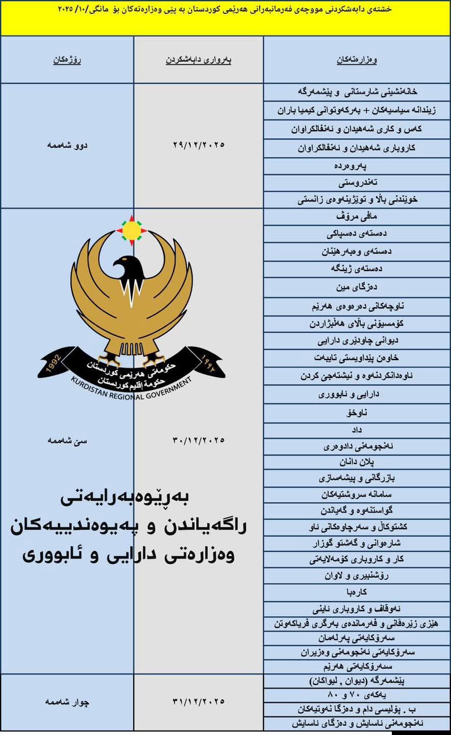 ئەمڕۆ یەکشەممە 28ی کانونی یەکەمی 2025، وەزارەتی دارایی و ئابووریی حکومەتی هەرێمی کوردستان خشتەی مووچەی مانگی تشرینی یەکەمی فەرمانبەران و مووچەخۆرانی هەرێمی بڵاوکردەوە.