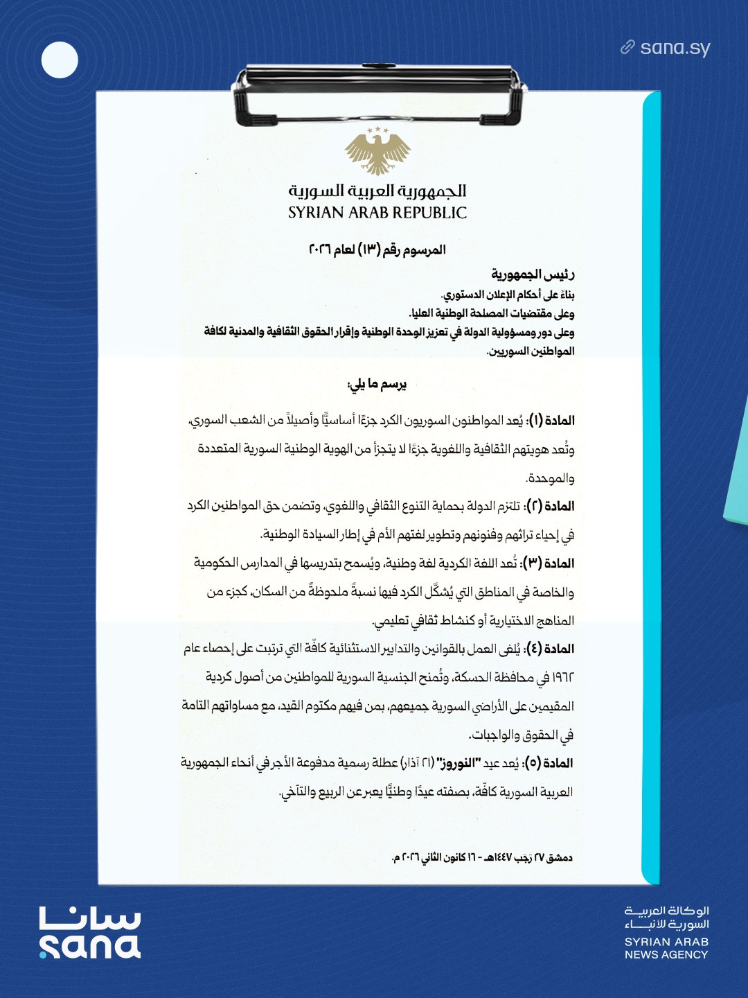 ئهحمهد شهرع سهرۆكی كاتی سوریا مهرسوومی ژماره (13)ی ساڵی 2026ی دهركرد، تێیدا جهخت لهوه دهكاتهوه كه هاوڵاتییانی كوردی سووریا بهشێكی بنهڕهتی و ڕهسهنی گهلی سوریان، و ناسنامهی كولتووری و زمانییان بهشێكی دانهبڕاوه له ناسنامهی نیشتمانیی سووریای فرهچهشن و یهكگرتوو.