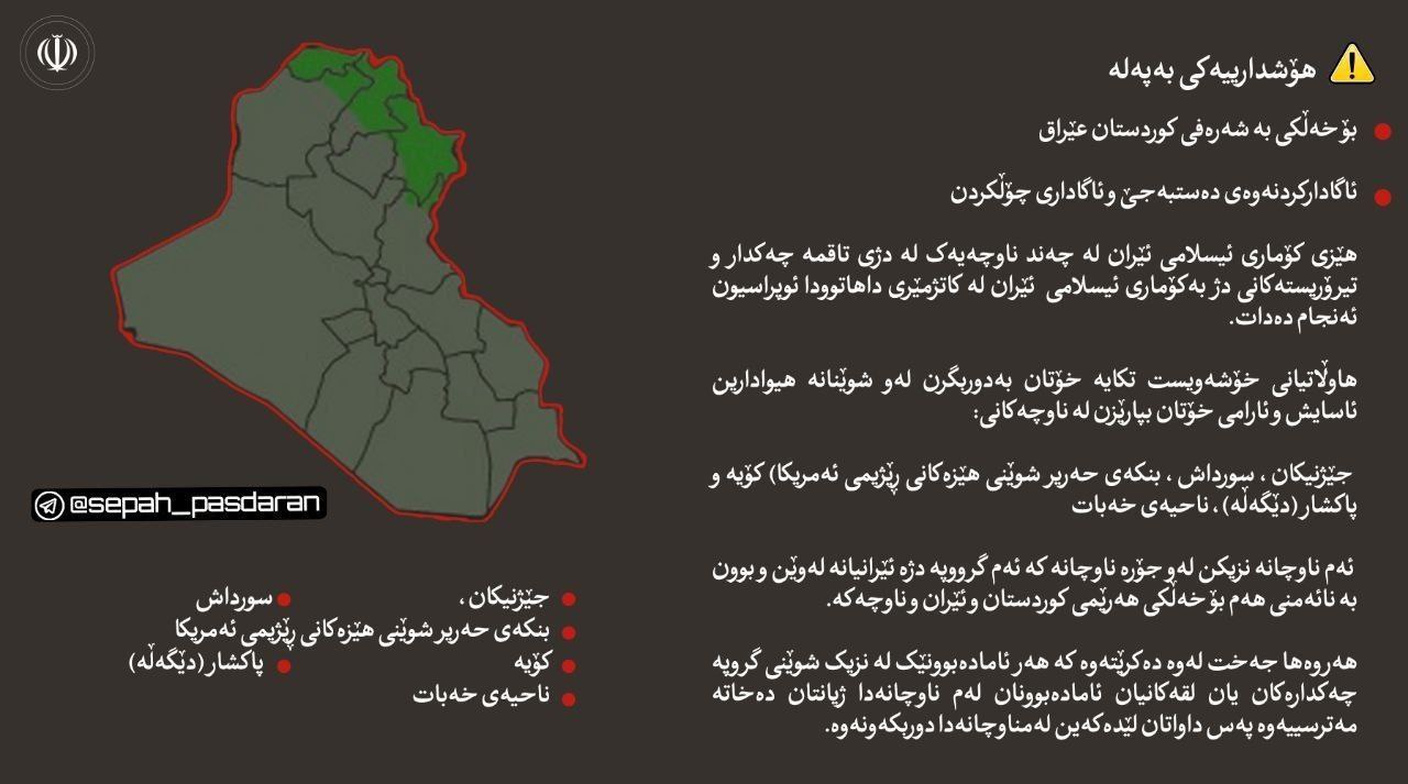 سوپای پاسداران بە هەردوو زمانی فارسی و کوردی هۆشدارییەک بۆ دانیشتوانی هەرێمی کوردستان بڵاودەکاتەوە.