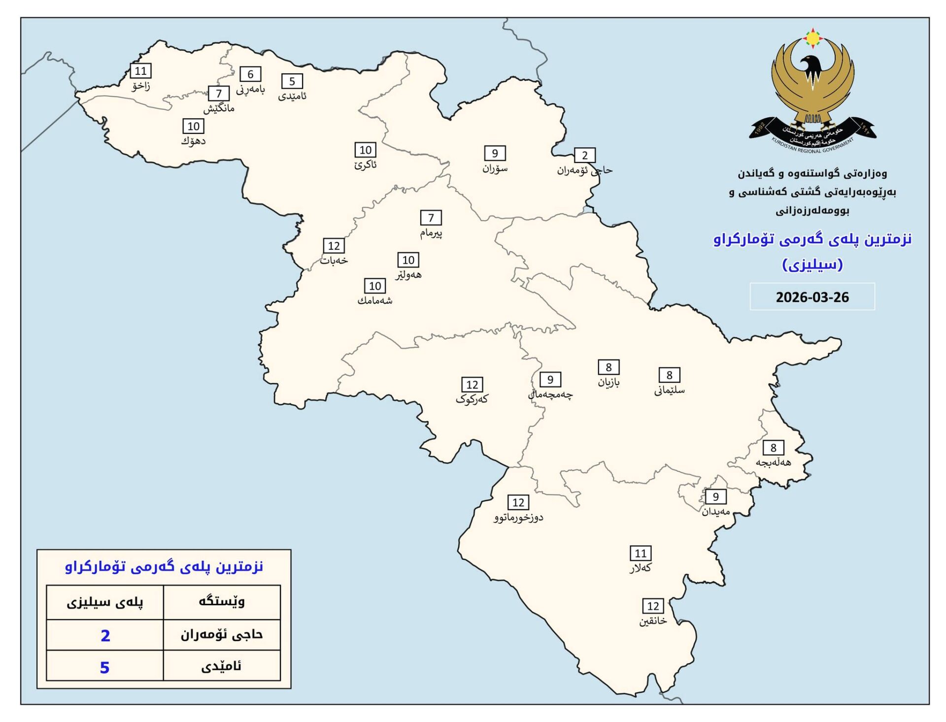 ڕایگەیاند، ئەمڕۆ پێنجشەممە 26ی ئاداری 2026، ئاسمان بە گشتی هەوری باراناوی دەبێت، نمە