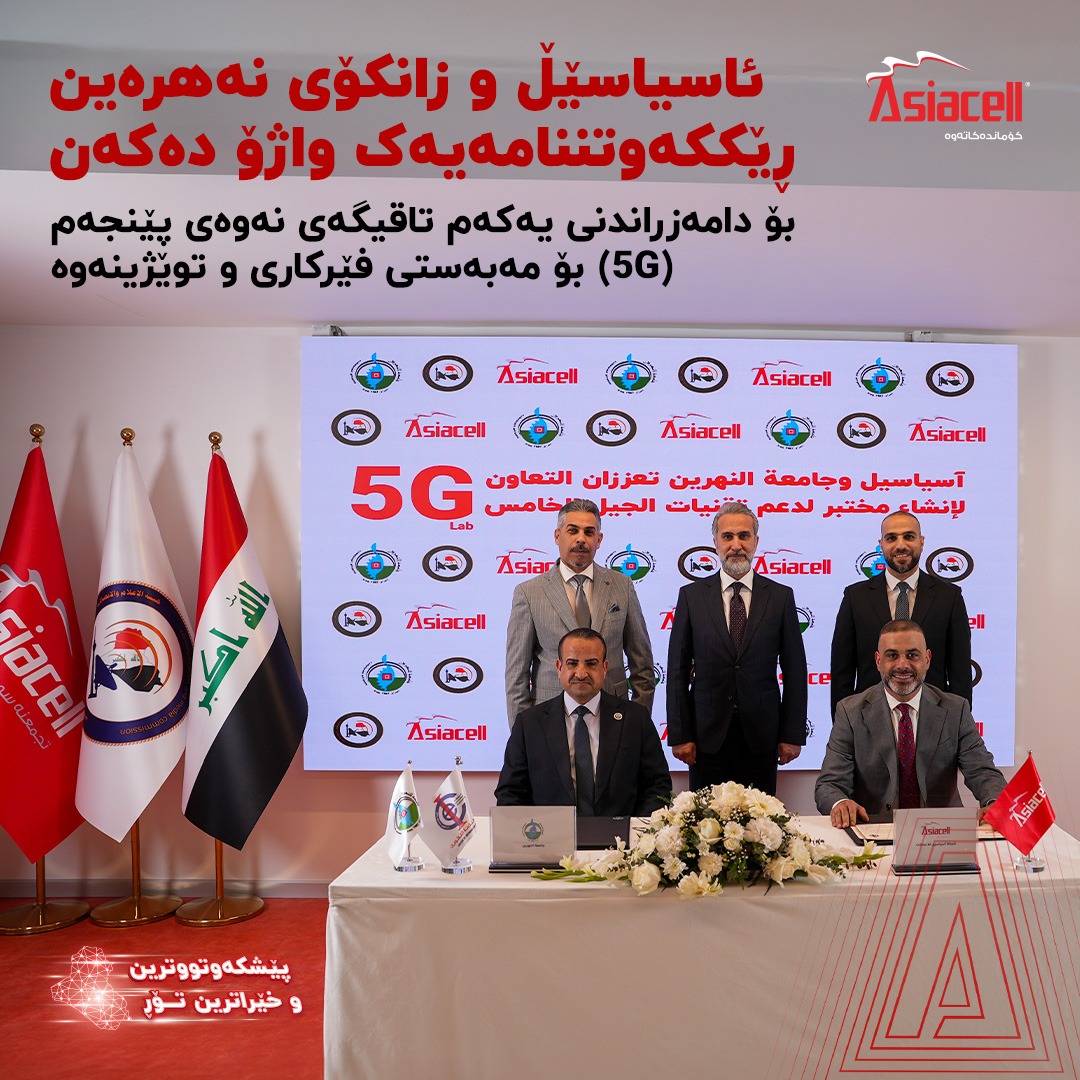 لە هەنگاوێکی بێ پێشینەدا، کە یەکەمینە لە عێراقدا، کۆمپانیای ئاسیاسێڵ ڕێکەوتنامەی کردنەوەی تاقیگەی نەوەی پێنجەم G5 لە کۆلێژی ئەندازیاری زانیاریی لە زانکۆی ئەلنەهرەین ڕادەگەیەنێت، بە پاڵپشتی و سپۆنسەری کۆمیسیۆنی ڕاگەیاندن و گەیاندن، بۆ بەهێزکردنی نەوەی داهاتوو لە ئەندازیاران و داهێنەرانی عێراقی.