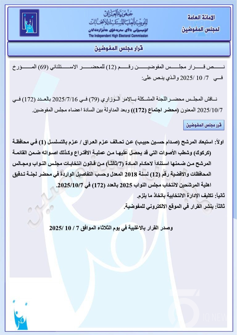 رۆژی 7ی تشرینی یهكهم ئهنجومهنی كۆمسیارانی كۆمسیۆنی باڵای ههڵبژاردنهكانی عێراق بهبڕیاری ژماره 12 بڕیاری دا ئهندازیار "سهدام حسێن ئهلنهعیمی" سهرۆكی لیستی هاوپهیمانی عهزمی سوننهكان له شاری كهركوك له ههڵبژاردن دوور بخاتهوه.