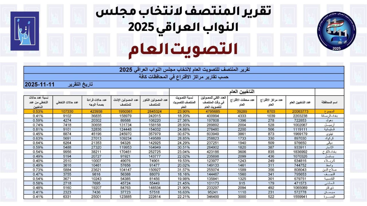 کۆمیسیۆنی باڵای سەربەخۆی هەڵبژاردنەکانی عێراق، رێژەی بەشداریی دەنگدەرانی تا نیوەڕۆی ئەمڕۆ سێشەممە، 11ـی تشرینی دووەمی 2025، لە دەنگدانی گشتیی پەرلەمانی عێراق بڵاوکردەوە.