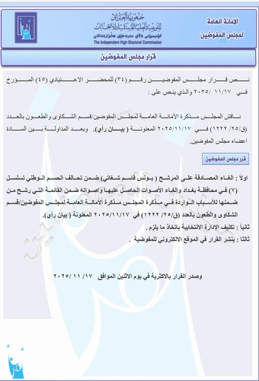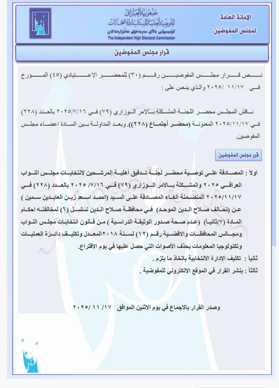بهگوێرهی ئهو نووسراوانهی دهست وێستگه كهوتوو، كۆمسیۆنی باڵای سهربهخۆی ههڵبژاردنهكان له شهش بڕیاری جیاوازدا، ههر یهك له؛ ئهحمهد ئهسعهد زێن عابدین له هاوپهیمانی سهڵاحهدین، یونس قاسم شغاتی له هاوپهیمانی حهسم له بازنهی بهغدا، نیهاد فهیسهڵ له هاوپهیمانی سیاده له بازنهی ئهنبار، خزهیر علێوی جهبار رهكاز له هاوپهیمانی حهسم له پارێزگای نهینهوا، هبه تۆفیق ههمزه له هاوپهیمانی حهسم و نوفل شهریف جهودهت كاندیدی سهربهخۆ له پارێزگای بهغدای دوورخستهوه.