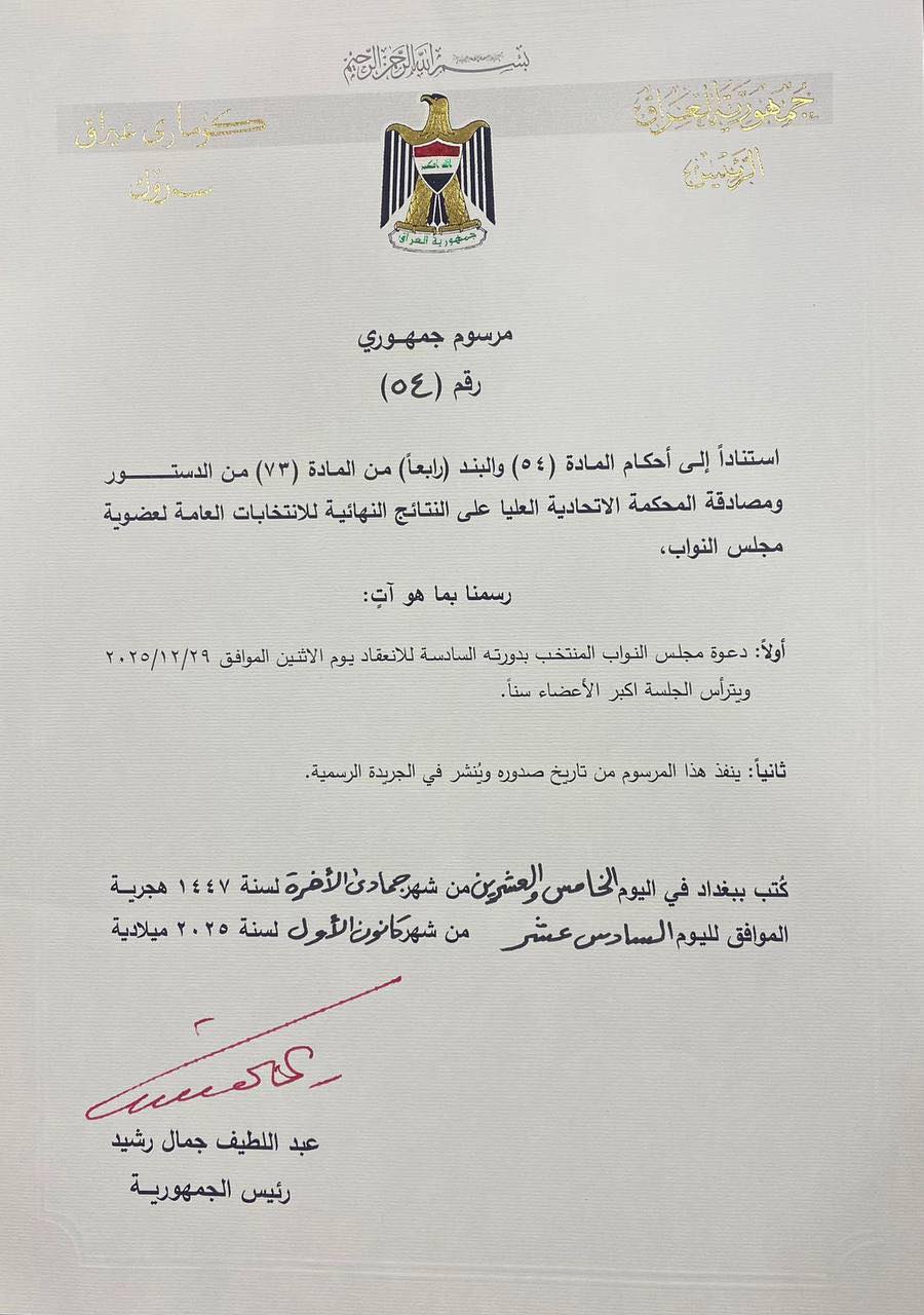 ئەمڕۆ سێشەممە، 16ى كانونی یەكەمی 2025، لەتیف رەشید، سەرۆک کۆماری عێراق مەرسومێكی كۆماری دەركرد و واژۆی لەسەر ئەنجامی هەڵبژاردنی پەرلەمانی عێراق کرد و 29ـی 12ـی بۆ یەکەم دانیشتنی پەرلەمانی عێراق دیاریکرد.
