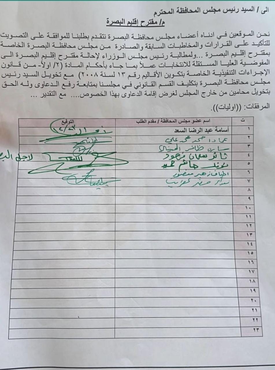 چەند ئەندامێكی ئەنجومەنی پارێزگای بەسرا ئیمزایان كۆكردووەتەوە و داوای ئەوە دەكەن پارێزگای بەسرا بكرێت بە هەرێم.