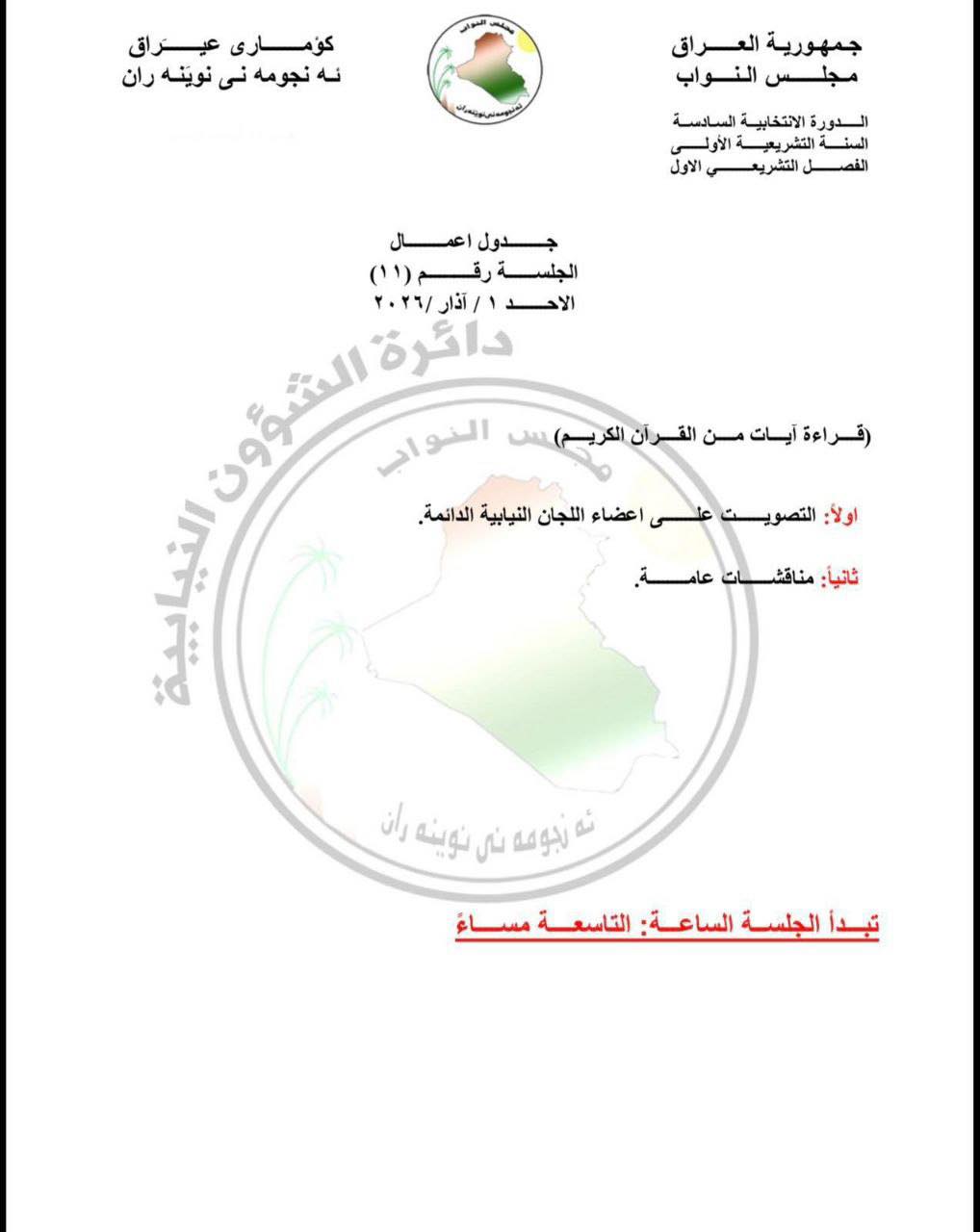 ئهمڕۆ پێنجشهممه 26ی شوباتی 2026 فهرمانگهی راگهیاندنی ئهنجومهنی نوێنهرانی عێراق، كارنامهی دانیشتنی ژماره (11)ی راگهیاند كه بڕیاره رۆژی یهكشهممه 1ی ئازار بهڕێوهبچێت.