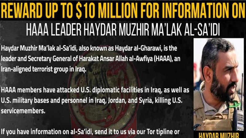 ئهمڕۆ دووشهممه وهزارهتی دهرهوهی ئهمریكا رایگهیاند كه بڕی 10 ملیۆن دۆلاری تهرخانكردووه وهك پاداشت بۆ ههر زانیارییهك كه ببێته هۆی دهستنیشانكردنی شوێنی حهیدهر مهزههر، ناسراو به حهیدهر غهراوی، سهرۆكی بزووتنهوهی "ئهنساروڵای ئهوفیا".