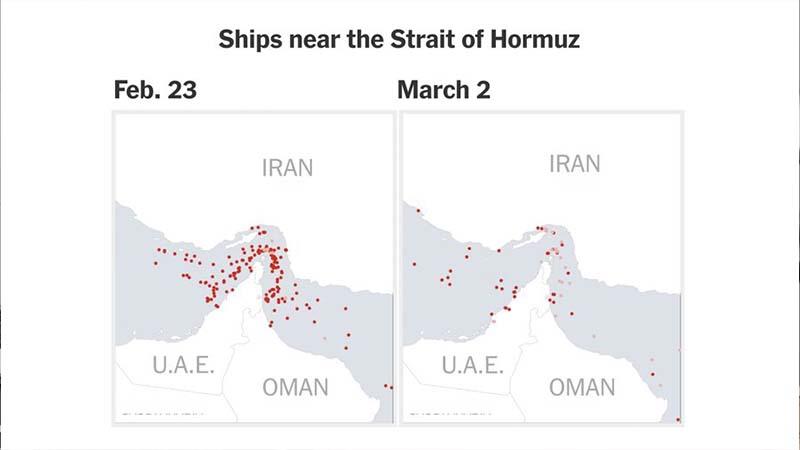 تانكهرهكان له دوای هێرشهكانی ئهمریكا و ئیسرائیل بۆ سهر ئێران كه له رۆژی شهممهوه دهستی پێكردووه، له گهرووی هورمز دوور دهكهونهوه. ململانێیهكی درێژخایهن دهكرێت كاریگهرییهكی گهوره لهسهر ئابووری جیهان دروست بكات و ههڕهشه له دابینكردنی وزهی ئهو وڵاتانه دهكات كه لهو سهری جیهانن، ئهمهش دهبێته هۆی بهرزبوونهوهی ههڵاوسان.