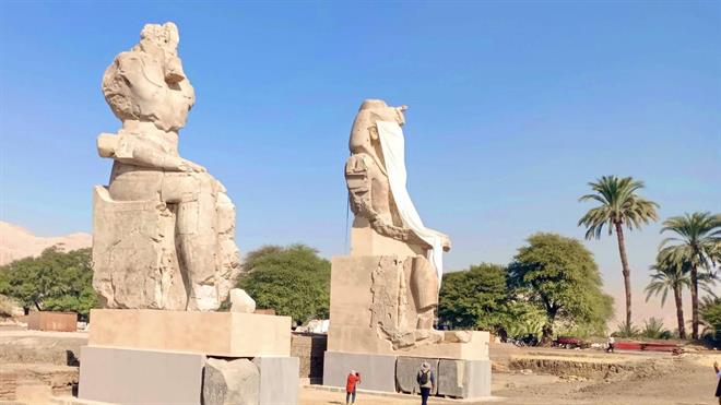 پەیکەرە نۆژەنکراوەکە کە بەرزییەکەی چەندین مەترە و کێشەکەی دەگاتە دەیان تەن، پاشا ئامونحوتێبی سێیەم لەسەر تەختێکی شاهانە نیشان دەدات لە کاتێکدا هەردوو دەستی لەسەر ئەژنۆکانی داناوە. پڕۆسەی چاککردنەوە و لێکبەستنی پارچەکانی ئەم شاكارە کارێکی زۆر سەخت و پڕ تێچوو بووە؛ پەیکەرەکە لە کاتی دۆزینەوەیدا بەسەر سەدەها پارچەی بچووک و گەورەدا دابەش ببوو و هەندێکیان لە ژێر لم و قوڕی نیلدا حەشار درابوون. تیمە پسپۆڕەکان بە بەکارهێنانی تەکنەلۆژیای وردی سێ ڕەهەندی و ماددەی کیمیایی پارێزەر، توانییان وەک مەتەڵێکی مێژوویی پارچەکان پێکەوە بلکێننەوە و پەیکەرەکە لە هەمان ئەو شوێنەدا جێگیر بکەنەوە کە نزیکەی ٣٤٠٠ ساڵ لەمەوبەر وەک پارێزەری پەرستگاکە ڕاوەستابوو.